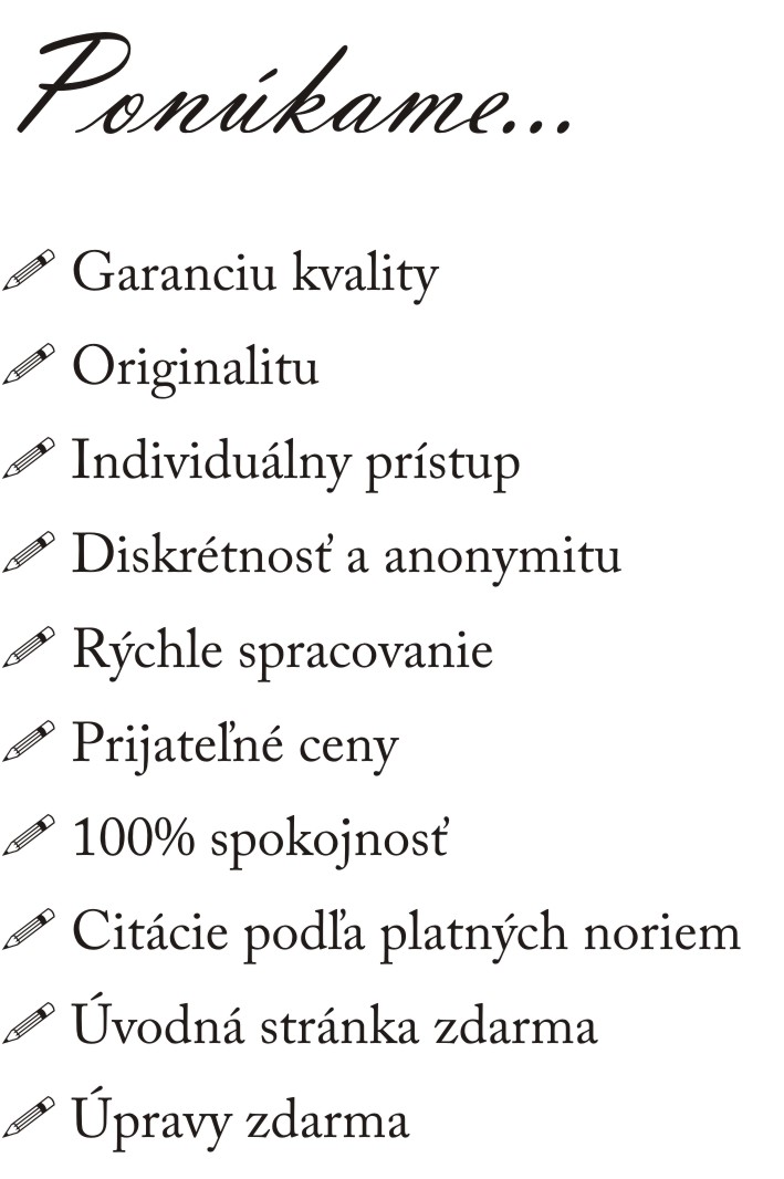 Študentov nenabádame k porušovaniu študijného poriadku. Pomôžeme Vám pri zhromažďovaní a upravení všetkých potrebných podkladov pre záverečné práce.